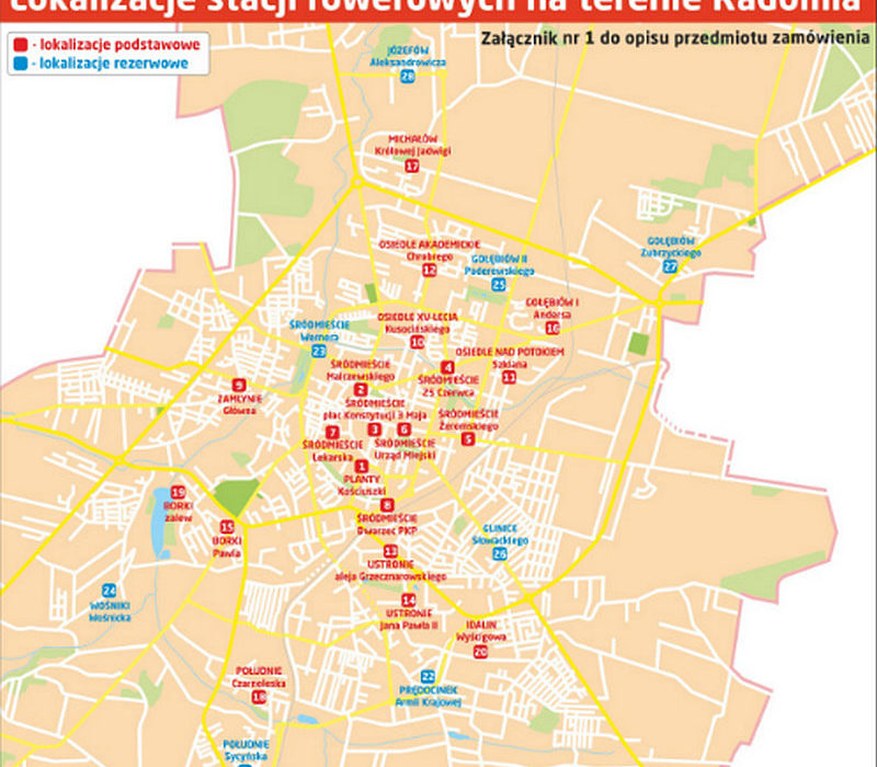 Na podstawie wspomnianych wyżej konsultacji społecznych, przedstawione zostały lokalizacje stacji rowerowych na terenie Radomia. Podstawowe lokalizacje obejmują Śródmieście (stacje przy ul. Malczewskiego, Wernera, Lekarskiej, pl. Konstytucji 3 Maja, skrzyżowaniu ul. Struga/25 Czerwca, Żeromskiego/ul. Zbrowskiego, przy Urzędzie Miejskim i na placu Dworcowym), Planty (skrzyżowanie ul. Kościuszki i ul. Narutowicza), Zamłynie (ul. Główna), Osiedle XV-lecia (ul. Kusocińskiego), Osiedle nad potokiem (ul. Szklana), Osiedla Akademickie (ul. Chrobrego), Ustronie (aleja Grzecznarowskiego, ul. Jana Pawła II), na Borkach (ul. Pawia oraz nad zalewem), Gołębiów I (ul. Andersa), Michałów (ul. Królowej Jadwigi), Południe (ul. Czarnoleska) oraz Idalin (ul. Wyścigowa). Wskazane zostały także lokalizacje rezerwowe na Południu (ul. Sycyńska), Prędocinku (ul. Armii Krajowej), Wośnikach (ul. Wośnicka), Gołębiowie (ul. Zubrzyckiego), Gołębiowie II (ul. Paderewskiego), Glinicach (ul Słowackiego) oraz Józefowie (ul. Aleksandrowicza).