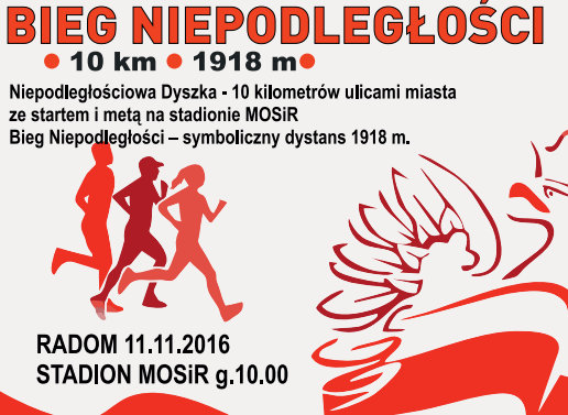 Stowarzyszenie „Biegiem Radom!”, MOSiR Radom we współpracy z Komendą Miejską Policji w Radomiu, Strażą Miejską, ZUK oraz MZDiK zapraszają do udziału w Niepodległościowej Dyszce i IV Radomskim Biegu Niepodległości pod honorowym patronatem Prezydenta Miasta Radomia – Radosława Witkowskiego
