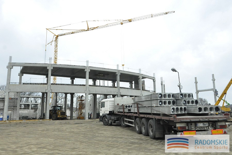 Przy konstrukcji obiektu finalizowane są prace związane z montażem słupów obwodowych ostatniej kondygnacji oraz belek. Codziennie na plac budowy docierają także kolejne transporty potrzebnych materiałów oraz płyt stropowych. Tych ostatnich jest już ponad tysiąc metrów kwadratowych!