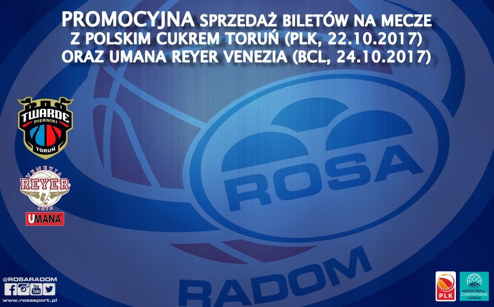 Zbliżają się dwa niezwykle interesujące pojedynki, które ROSA Radom rozegra przed własną publicznością. W niedzielę 22 października o godz. 12.30 w meczu na szczycie Polskiej Ligi Koszykówki zmierzą się z Polskim Cukrem Toruń. Dwa dni później ROSA podejmie w Basketball Champions League mistrza Włoch – Umana Reyer Wenecja.
