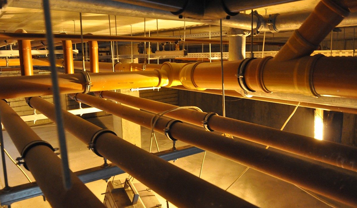 Na obiekcie prowadzone są także roboty murowe i montażowe przy kolejnych, potężnych elementach prefabrykowanych. Trwają prace w zakresie montażu pokrycia stropodachu, montażu odwodnienia i kanalizacji deszczowej. Wykonano ściany działowe oraz wylewki w piwnicach. Na poziomie -1, tam, gdzie znajdą się pomieszczenia techniczne, a obecnie uwidoczniony został labirynt różnego typu instalacji (na zdjęciu), rozpoczął się nawet montaż glazury.