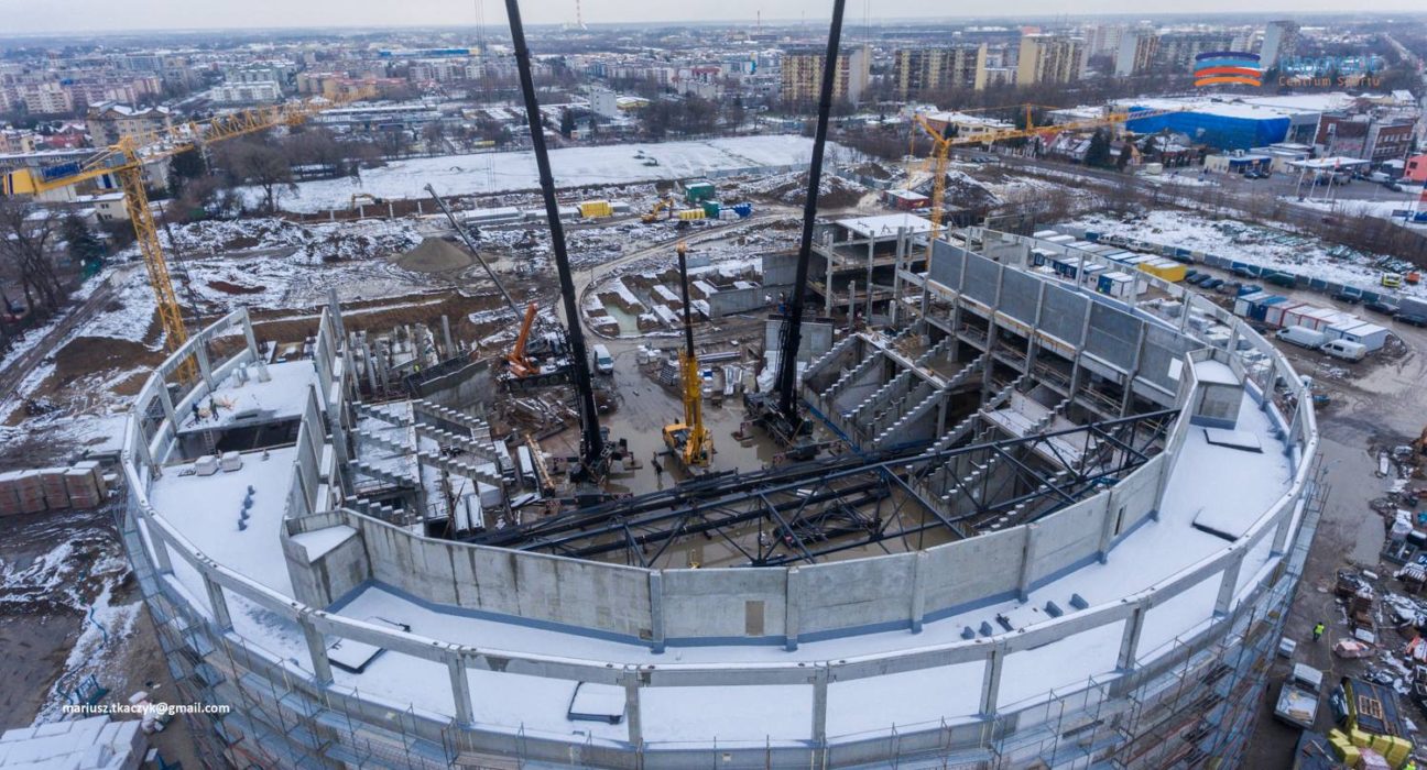 Zgodnie z ubiegłotygodniowymi zapowiedziami, przy użyciu specjalistycznego sprzętu, rozpoczął się montaż kolejnych potężnych dźwigarów konstrukcji dachu hali sportowo-widowiskowej