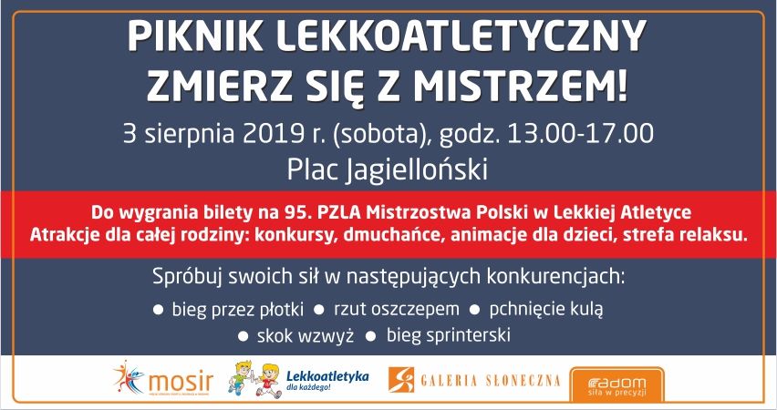 Bądźcie z nami 3 sierpnia w godz. 13:00-17:00 na Placu Jagiellońskim! Do wygrania będą bilety na 95. PZLA Mistrzostwa Polski w Lekkiej Atletyce. Nie zabraknie animatorów, dmuchańców i strefy relaksu. Zapraszamy!