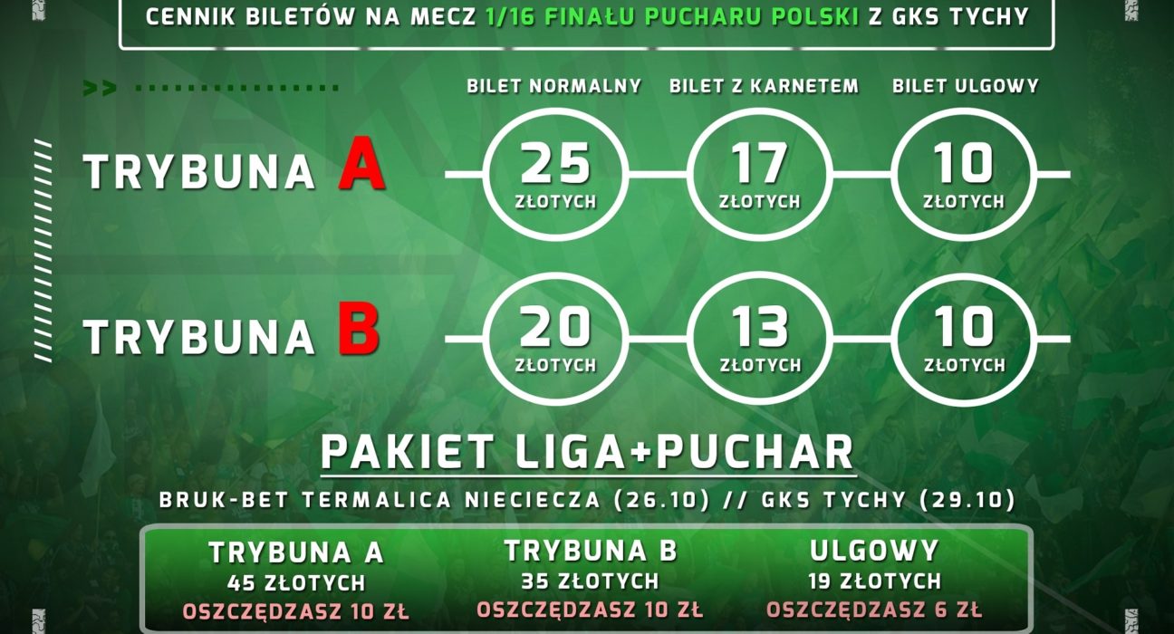 Mecz z Bruk-Bet Termalicą Nieciecza odbędzie się w najbliższą sobotę o godzinie 14:00. Z kolei spotkanie 1/16 Pucharu Polski z GKS Tychy zaplanowane jest na 29 października, tj. wtorek o godzinie 13:00. Przedsprzedaż biletów na oba spotkania wystartowała we wtorek. Zachęcamy do zakupu wejściówek, a w szczególności do pakietu liga+puchar w korzystnej cenie. Przypominamy także, że dla posiadaczy karnetów obowiązuje specjalna zniżka na zakup biletu na Pucharu Polski z GKS Tychy.