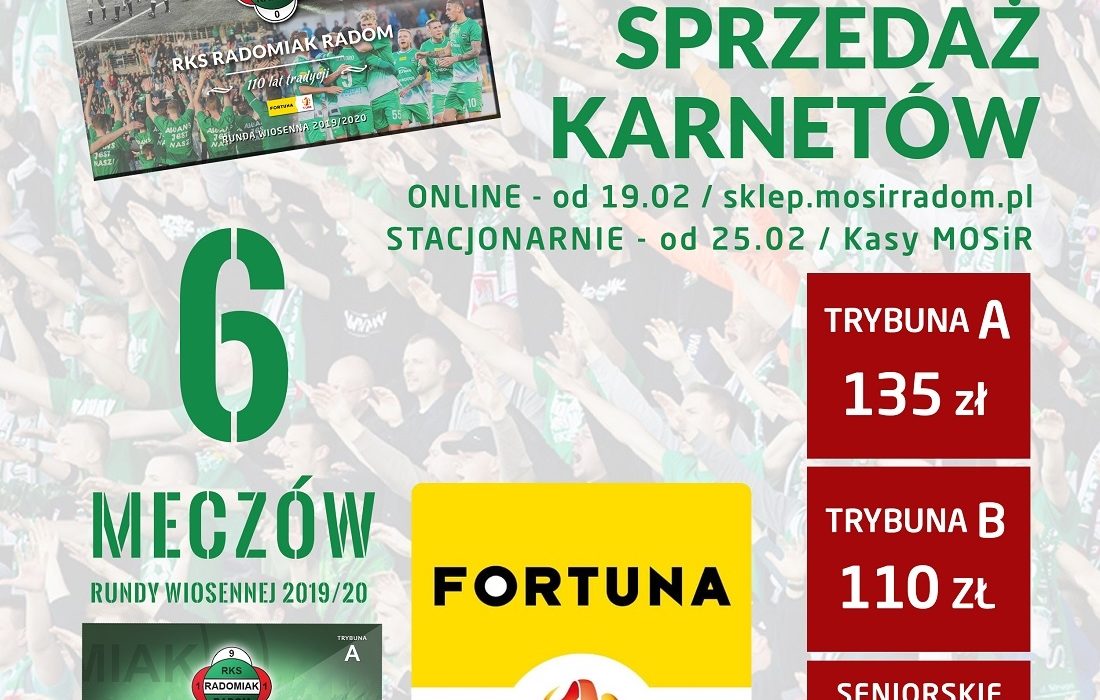 Od wtorku w kasach przy stadionie MOSiR przy ul. Narutowicza można będzie kupić karnet na mecze Radomiaka na rundę wiosenną w sprzedaży stacjonarnej lub odebrać karnet zakupiony drogą internetową.