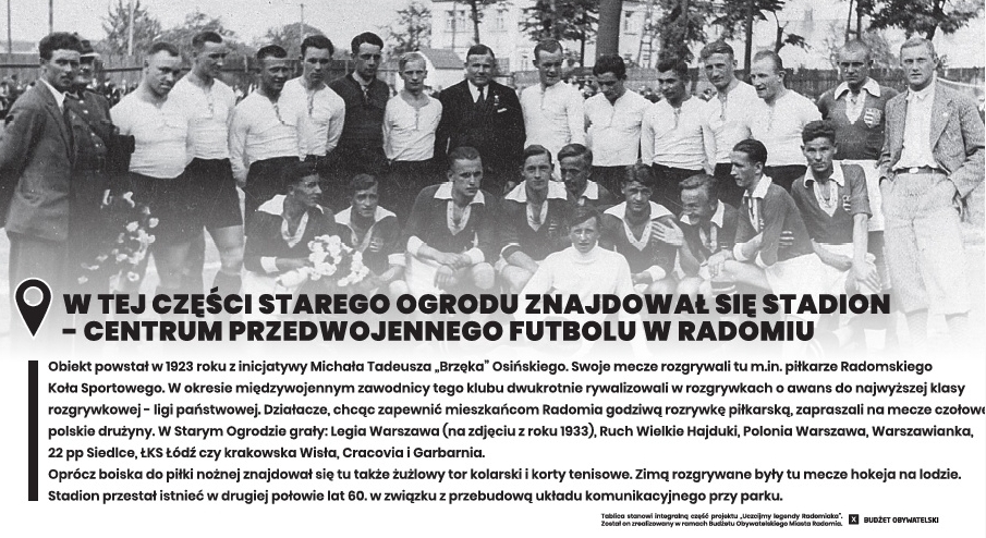 Tablica pamiątkowa, która właśnie zyskała nową formę, od początku miała na celu przypomnienie niezwykle ważnego dla radomskiego sportu miejsca. – Wiele osób podkreślało, że dopiero w trakcie prac dowiedziało się o jego znaczeniu dla lokalnej historii – podkreśla Michał Podlewski, pomysłodawca projektu. Swoje mecze rozgrywali tu m.in. piłkarze Radomskiego Koła Sportowego. W okresie międzywojennym zawodnicy tego klubu dwukrotnie rywalizowali w rozgrywkach o awans do najwyższej klasy rozgrywkowej – ligi państwowej. Oprócz boiska do piłki nożnej znajdował się tu także żużlowy tor kolarski i korty tenisowe. Zimą rozgrywane były tu mecze hokeja na lodzie.Stadion w Starym Ogrodzieprzestał istnieć w drugiej połowie lat 60. w związku z przebudową układu komunikacyjnego przy parku.