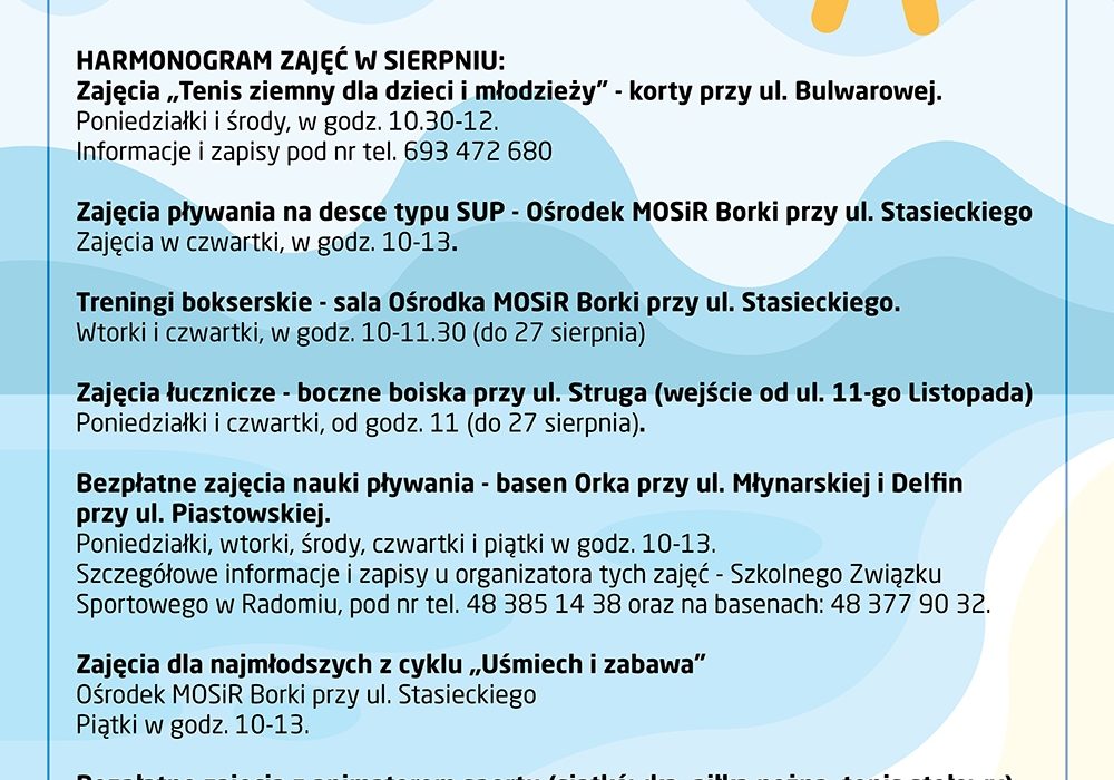 Miejski Ośrodek Sportu i Rekreacji w Radomiu zadbał o to, żeby w ramach „Akcji Lato 2021” w wakacje zagwarantować najmłodszym mieszkańcom dostęp do wielu atrakcji. Zobacz, na jakie zajęcia zapraszamy w sierpniu!