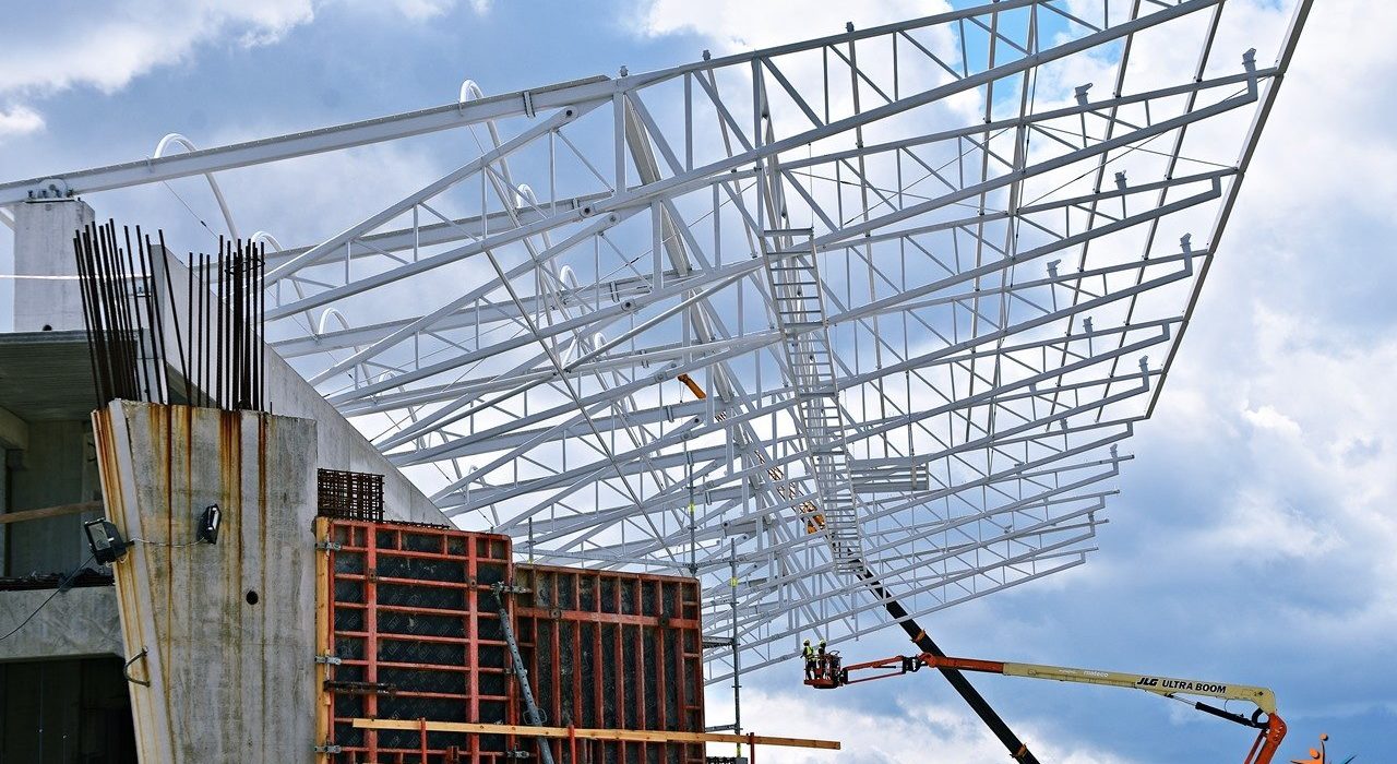 Na budowie trwa montaż elementów stalowych dachu na trybunie południowej stadionu. Układane są również elementy betonowe. Kontynuowane są również prace przy narożnikach trybuny południowej.