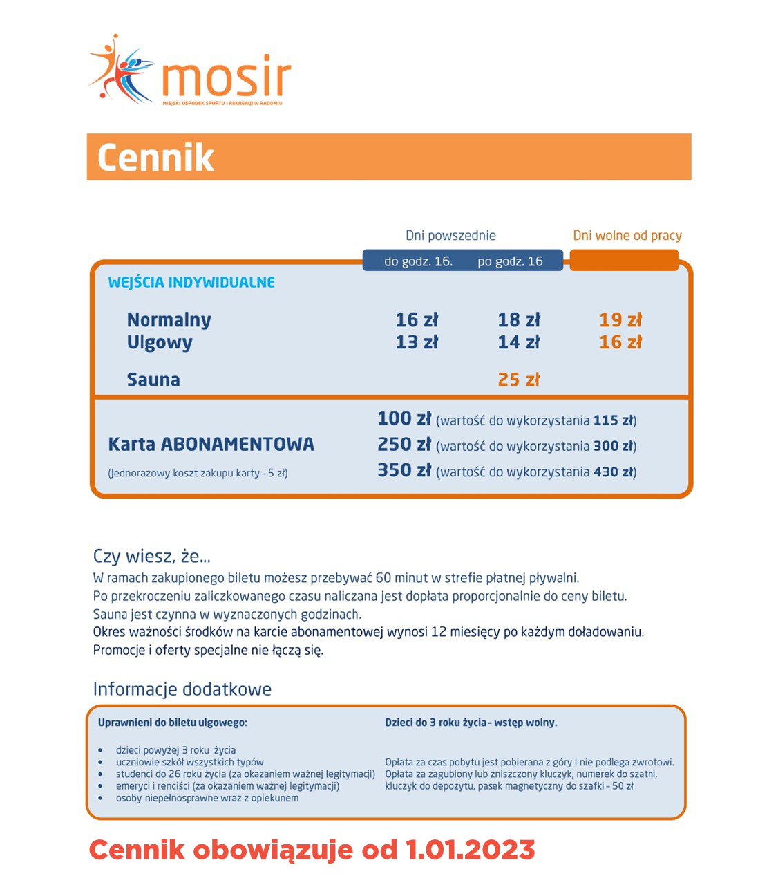 Osoby przebywające na basenie mogą z niego korzystać przez 60 minut, po tym czasie jest naliczana dopłata za każdą rozpoczętą minutę. Dopłata jest przedłużeniem czasu korzystania z pływalni i jest liczona według obowiązującej stawki. Obiekt wyposażony jest również w saunę, którą włączamy także indywidualnie, po wcześniejszym telefonicznym kontakcie w celu rezerwacji dla minimum trzech osób.